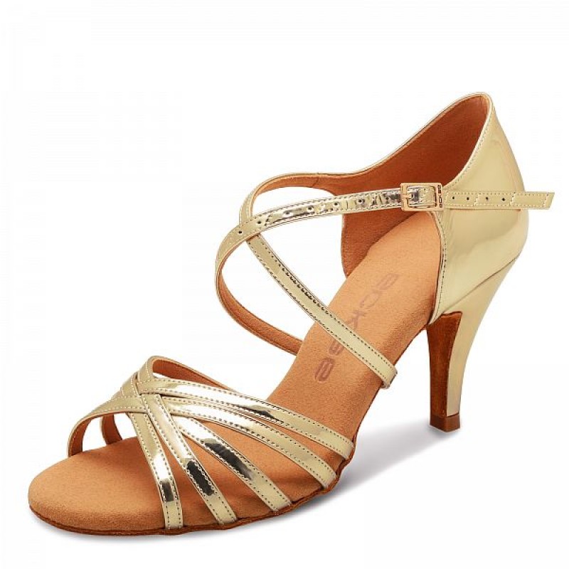 Женские туфли для латиноамериканских танцев из коллекции "Star". Туфли очень удобные и подходят как для продолжительных тренировок, так и для выступлений. Материал обуви: лак золотое зеркало, каблук 80SL. Длинный ремешок хорошо фиксирует стопу, форма носка Round, задинка: ТA. Туфли изготавливаются в различных цветах и материалах и с высотой каблука 50, 60, 70, 80 и 85 мм, в форме клеш и слим.