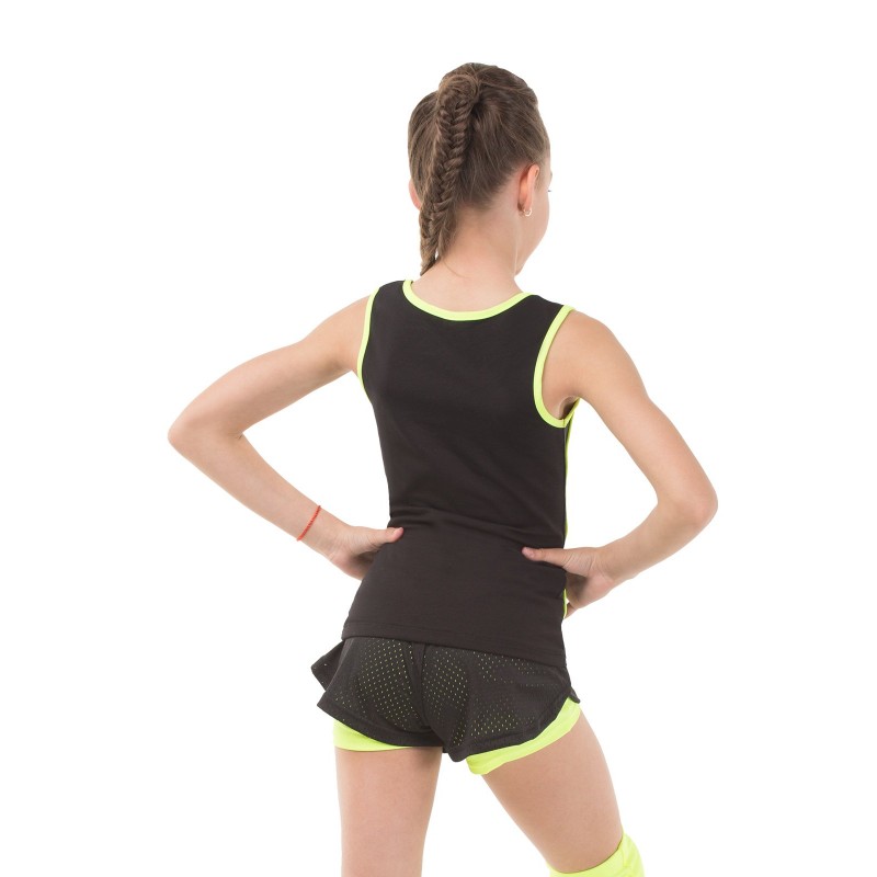 Облегающая майка чёрного цвета с закрытыми лопатками. Боковые вставки из чёрной трикотажной сетки. Тонкие контрастные вертикальные кантики, окантовка рукавов и горловины выполнены в ярком неоновом цвете. Золотистый логотип Solo размера 3х3 см нанесён вверху слева. Основной материал изделия – хлопок с лайкрой